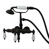 Kingston Brass CC21T5 Vintage Down Spout Wall Mount Leg Tub Faucet with Hand Shower, 3-3/8" Spread, Dark Bronze Solid brass construction for durability and reliability, Premium color finish resist tarnishing and corrosion, 1/4 turn ceramic disk cartridge, Vacuum breaker for backflow prevention, 3 3/8" center-to-center spread, Vacuum Breaker in Handheld. Kingston Brass CC21T5 Vintage Down Spout Wall Mount Leg Tub Faucet with Hand Shower, 3-3/8" Spread, Dark Bronze Features: Brass Construction H&C Porcelain Lever Handle Dark Bronze Finish 3-3/8 Spread 2.4 GPM (9 LPM) Max @ 60 PSI Kingston Brass CC21T5 Centerspread Tub-Wall Mount Clawfoot Tub Filler with Hand Shower Oil Rubbed Bronze Oil Rubbed Bronze Finish Tub-Wall Mount Clawfoot Tub Filler 1/4 Turn Ceramic Disk Cartridge 3-3/4 Spout Reach 3-3/8 Spread